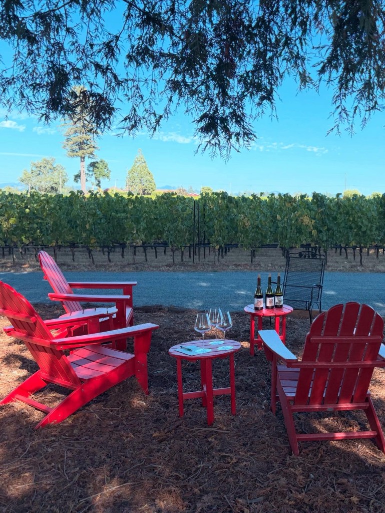 Our first wine tasting stop is Alma Fria. We are sitting in red Adirondack garden chairs under a redwood grove, overlooking rows of grapevines. Carroll, the man behind Alma Fria, pours us his wine selection as he shares his life story and decision to move his whole family to this wild coast in his pursuit of fresher, more graceful expressions of Pinot Noir. His wines prove that his gamble paid of: