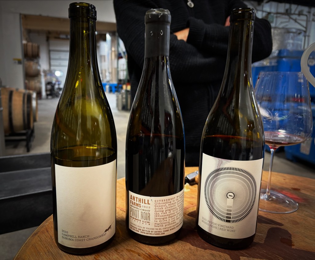 We taste Anthill’s line-up. The Campbell Ranch Vineyard Chardonnay (2022) is cold, acidic, and bracing. A true coastal Chardonnay with a salty, reductive, and citrus-forward profile. (4.1/5) The Sonoma Coast Pinot Noir (2023) is noticeably richer and clove/tobacco-forward than anything we tried the previous day. (3.9/5)